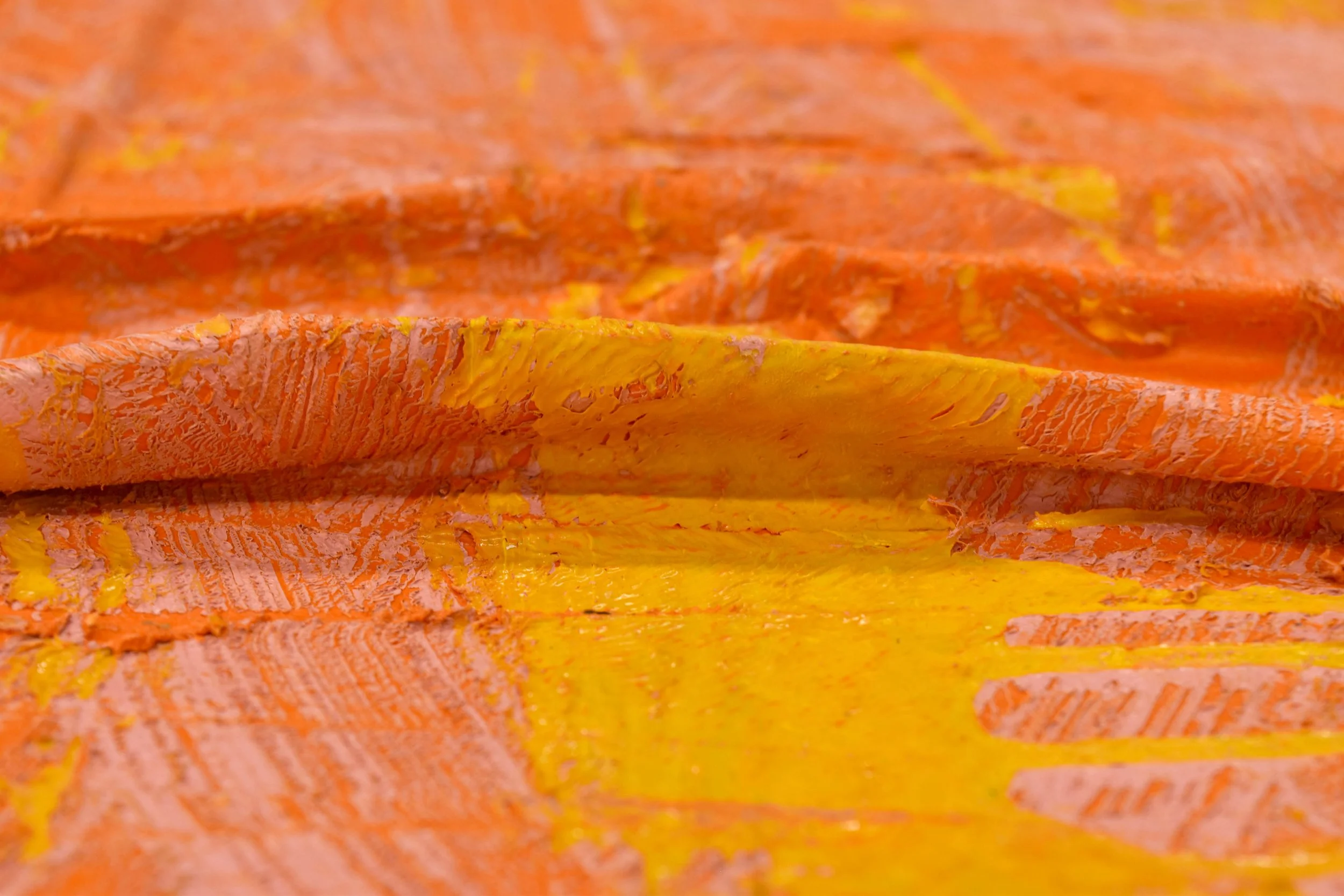 Angel Otero was born in 1981 in Puerto Rico, where he lived until moving to the United States to study painting at the Art Institute of Chicago. His unique process involves painting directly onto glass and then delicately peeling the “oil skin” sheets off while partially cured, which are then layered onto surfaces to create a dimensional and textured composition. His technique employs unconventional techniques to create large scale expressionistic abstractions.