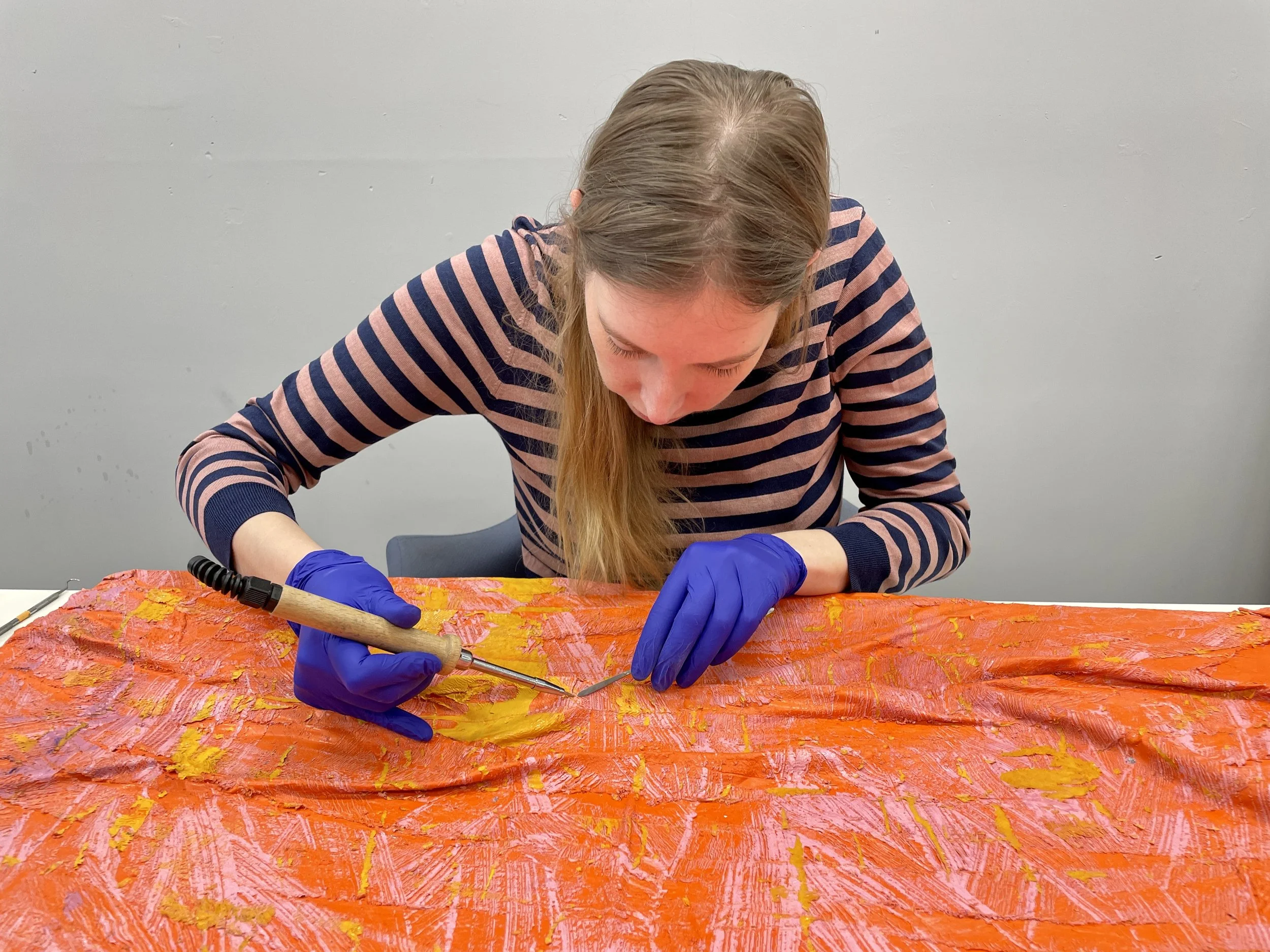 Our Paintings Fellow, who specializes in 20th century modern materials, began the initial assessment with research into the artist’s technique followed by testing of the oil skin surfaces in order to develop a unique treatment plan. The treatment included gentle dry cleaning of the oil skin without disturbing the fragile surface, followed by creating a mechanical support made from Japanese tissue, which was inserted into the hollow fold to prevent the impact crack from failing. The crack was then manipulated and realigned with gentle heat, and the oil skin reformed and set with adhesive to seamlessly repair the impact damage.