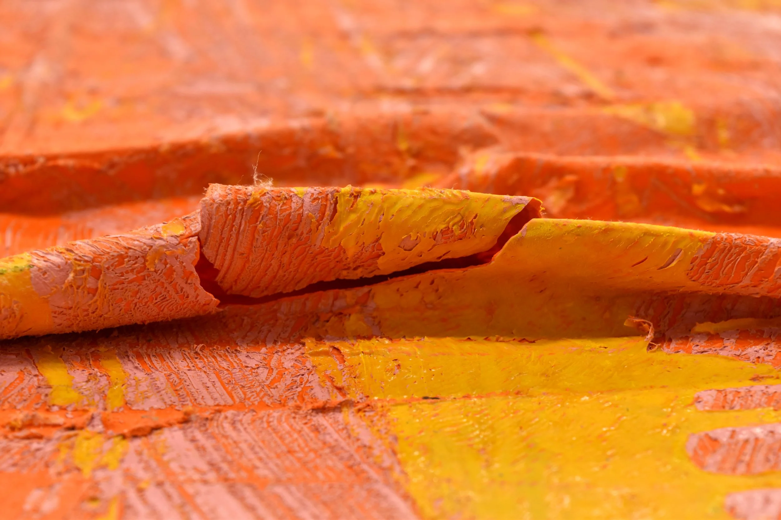 Accidents happen! Our client was remodeling his residence when the contractor accidentally abraded and cracked the surface of this painting by Angel Otero titled TBD-SK Q, 2011. The impact damage was concentrated in the hollow of a fragile and thin three-dimensional fold of paint skin on the surface of the painting.