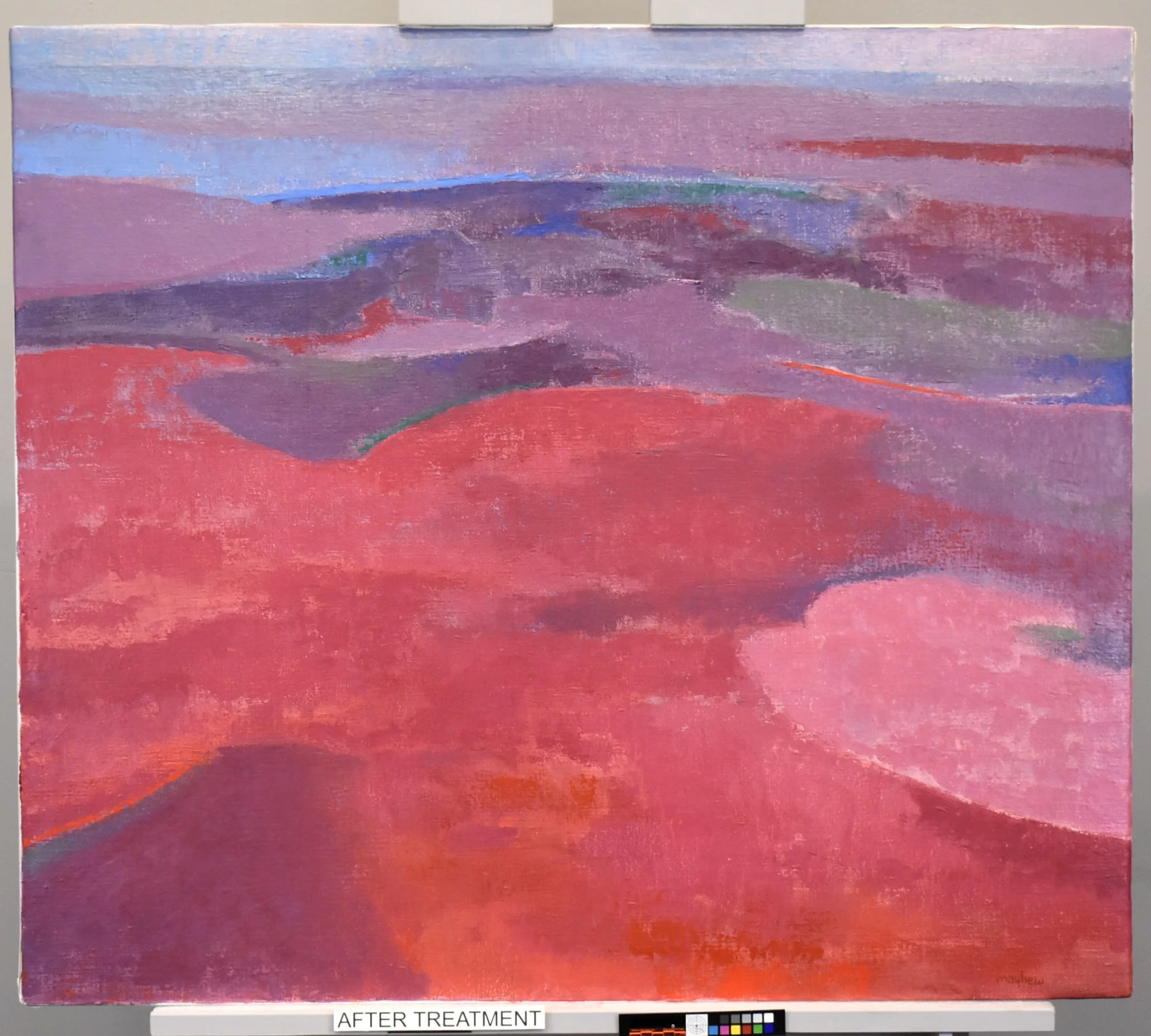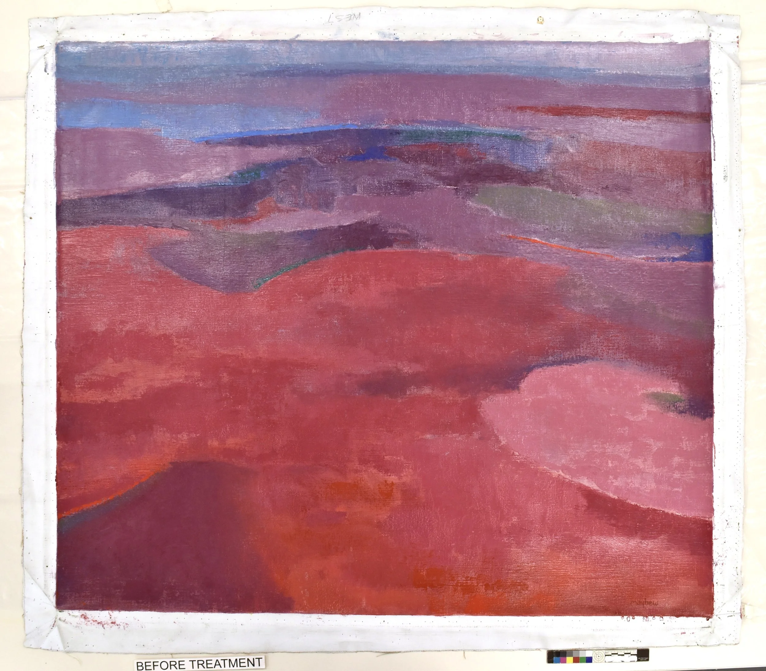 West, 1980, by Richard Mayhew is an abstracted landscape in vivid tones of pink, purple, and blue. It was delivered to the studio with several other paintings, including another untitled landscape from 1980, which had been previously unstretched and stored rolled for several decades in Mayhew’s studio. All the rolled paintings in the bundle had several areas where the top paint layer had delaminated from a glossy underlayer, causing the paint film to be unstable and incur losses. Treatment began with consolidant testing, followed by applying Aquazol between the top two paint layers with a brush before setting with a heated spatula to consolidate the delaminating, lifting paint. Once the paint film was stabilized, the painting was re-tensioned onto a custom, basswood stretcher. The painting could then be surface cleaned, losses filled, and finally cosmetically integrated, and inpainted.