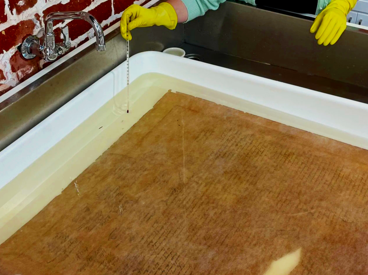 The second edition print of The Declaration of Independence arrived at Preservation Arts’ studio with soot, water damage, and severely structurally compromised—a firefighter’s axe had gone through the center of the document during the emergency response. Further, the enclosed environment of the vehicle acted as an artificial aging chamber, leading to severe embrittlement, discoloration, and fragility of the paper substrate. Treatment began with unframing the print and allowing it to aerate for several weeks to dissipate the odor and off-gassing. This was followed by careful dry cleaning to remove surface soot, and then extensive immersion washing. Once the print had been stabilized, individual fragments could be repositioned, and areas of loss were aligned more accurately. The print was then lined to provide structural support, sized, pressed, and flattened.